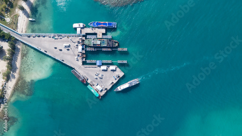 Aerial view of Koh Phangan international port with boats in the clear blue sea