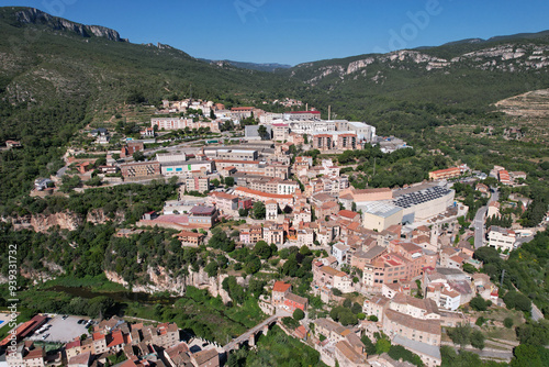 Aerial view of La Riba town on sunny summer day. Tarragona Province, Catalonia, Spain.