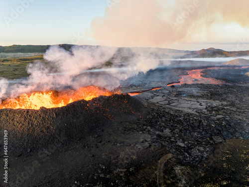 Aerial view of Litli-Hrutur (Little Ram) Volcano during an eruption on Fagradalsfjall volcanic area in southwest Iceland, it's a fissure eruption started on the Reykjanes Peninsula, Iceland.