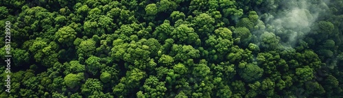 Aerial view of lush green forest canopy with a hint of mist, showcasing the natural beauty and tranquility of untouched wilderness.
