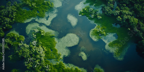 Aerial View of Lush Green Mangrove Forest Over Water