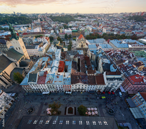Aerial view of Lviv with Rynok Square, Latin Cathedral and Jesuit Church - Lviv, Ukraine