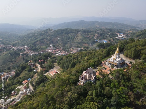 Aerial view of Mae Salong Village and the "Princess Mother Pagoda", a KMT Kuomintang Chinese village located in the mountain area at the Burmese border in Thailand's Chiang Rai Province.
