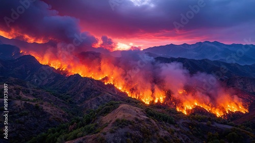 Aerial view of massive wildfire with smoke concept. A dramatic wildfire engulfing a mountain landscape at dusk.