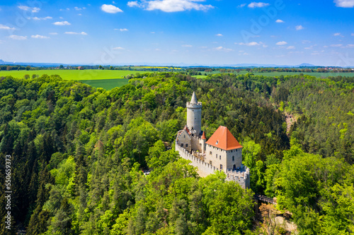 Aerial view of medieval castle Kokorin nearby Prague in Czechia. Central Europe. Medieval gothic castle Kokorin, Kokorinsko protected landscape area in Czech Republic. Medieval gothic castle Kokorin.