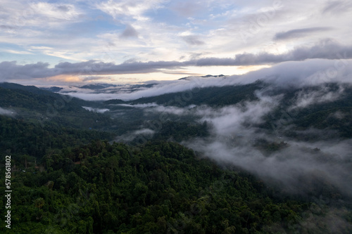 Aerial view of mist, cloud and fog hanging over a lush tropical rainforest after a storm