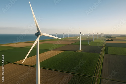 Aerial View of Modern Wind Turbines Generating Clean Energy on Farmland Near the Coastline