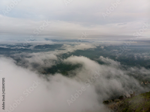 Aerial view of nature scenery. An aerial shot of hill with cloudy and misty background.