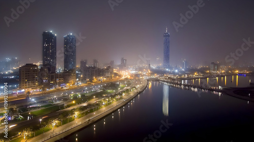 city, night, urban, skyscraper, illuminated, light, water, river, landscape, aerial, panorama, architecture, modern, building, city landscape, foggy, smog, twilight, dusk, downtown, night view, city landscape, city lights, waterfront, park, paseo, path, highrise, illumination, night time, facades, view, tower, modern architecture, building exterior, urban area