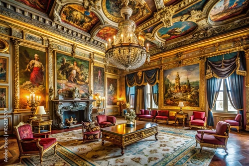 Aerial View of Opulent Renaissance Palace Parlor with Gilded Accents, Luxurious Furnishings, and Stunning Frescoed