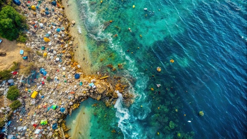 Aerial view of polluted sea with garbage, plastic waste, and oil spills, pollution, ocean, environmental