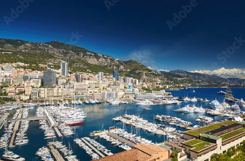 Aerial view of port Hercules in Monaco - Monte-Carlo at sunny day, a lot of yachts and boats are moored in marina, mediterranean sea