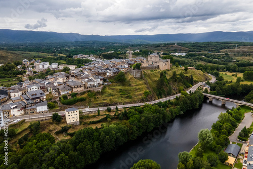 Aerial view of Puebla de Sanabria, a small town with a medieval castle along the Rio Tera river in Zamora, Spain.