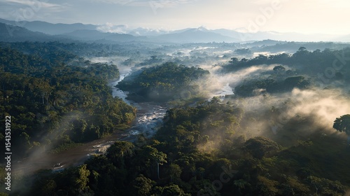 Aerial view of rainforest with lush green vegetation, meandering river flowing left to right through dense jungle, mists rising to enhance natural mystery.