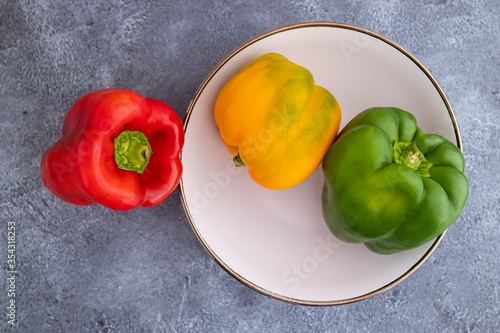 Aerial view of red, green and yellow peppers