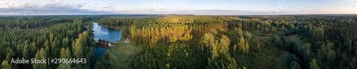 Aerial view of river among the forest. Summer nature landscape. Sunset.