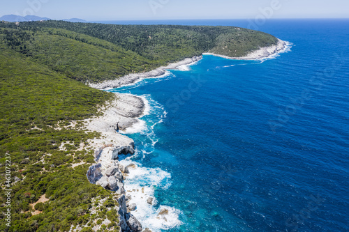 Aerial view of rocky coastline near Dafnoudi beach in Kefalonia, Greece