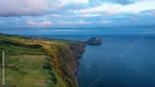 Aerial view of rugged cliffs and serene coastline with lush greenery and azure ocean, Horta, Azores, Portugal.