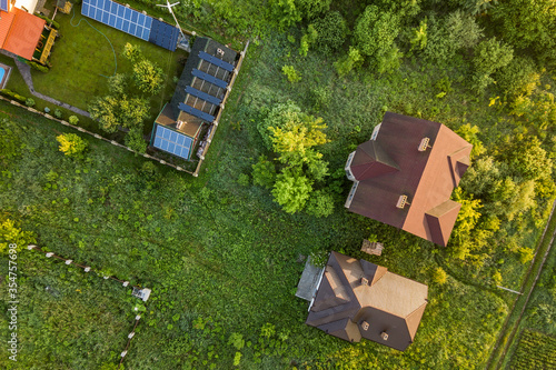 Aerial view of rural residential area with private homes between green fields at sunrise.