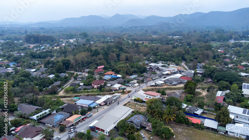 Aerial View of Rural Village with Mountainous Horizon in North of Thailand Chiang Mai