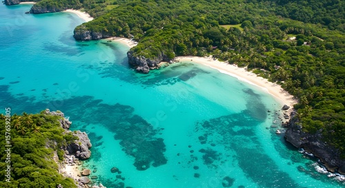 aerial, view, cove, tropical, turquoise, water, ocean, sea, beach, sand, white, lush, greenery, vegetation, forest, jungle, palm tree, tree, rock, cliff, coastline, coast, island, paradise, idylli, secluded, hidden, summer, sunlight, sunshine, bright, vibrant, clear, calm, tranquil, peaceful, serene, beauty, nature, landscape, photo, drone, aerial photography, exotic, caribbean, tropical island, vacation
