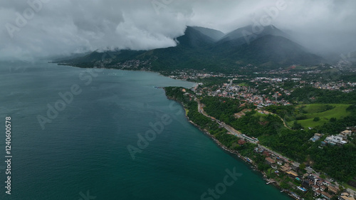Aerial view of serene coastal mountains and lush greenery shrouded in fog, Ilhabela, Brazil.