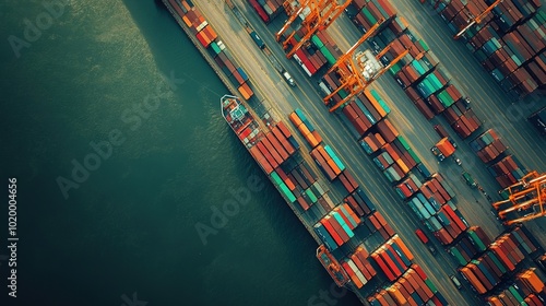 aerial, shipping, container, port, cargo, industry, transport, logistic, freight, marin, import, export, vessel, dock, scene, overhead, terminal, loading, unloading, colourful, supply, chain, harbor, ocean, trade, travel, business, economy, design, pattern, environment, distribution, urban, city, infrastructure, work, transportation, water, good, technology, equipment, machinery, labor, crane, arrangement, organisation, management