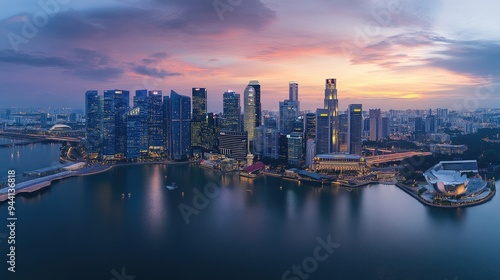 Aerial view of Singapore business district and city at twilight in Singapore, Asia