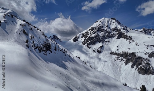 aerial, snow, mountain, range, tree, blue, sky, day, cloudy, winter, landscape, mountain, peak, scenic, nature, white, travel, high, cold, environment, adventure, snowy, top, rock, hill, ice, summit, covered, altitude, mountainous, wilderness, alpine, panorama, view, background, cloud, height, terrain, snowfall, frost, glacé, icy, fir, evergreen, pine, timberland