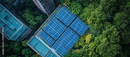 solar panel, building, rooftop, city, urban, green, energy, renewable, technology, environment, sustainable, environmentally friendly, alternative, power, clean, blue, aerial, view, overhead, perspective, photovoltaic, electricity, sun, light, sky, nature, tree, leaf, foliage, green energy, solar energy, renewable energy, clean energy, environmental, innovation, progress, future, development, conservation, efficiency, climate, change, global, warming, sustainability