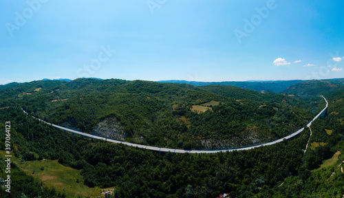 Aerial view of Strada Regionale 578 Cicolana Capradosso in central Italy. Old settlements. Top of the mountain. The hinterland of the country.