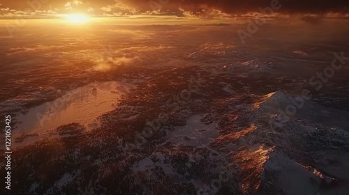 sunset, mountain, snow, aerial, winter, landscape, view, sky, cloud, orange, red, light, sun, ray, horizon, cold, frost, peak, range, vale, tree, forest, wilderness, nature, scenic, beautiful, majestic, serene, tranquil, calm, peaceful, dramatic, breathtaking, vibrant, gold, illumination, shadow, altitude, perspective, elevation, environment, atmosphere