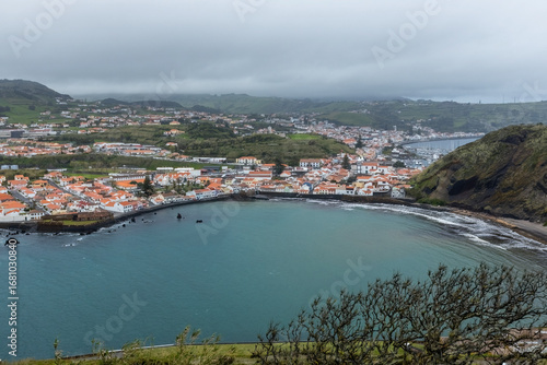 Aerial View of the bay of Horta town at Faial island at Azores Portugal