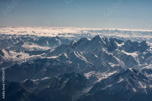 Aerial view of the beautiful snowy peaks of the Himalayan mountain range, Pakistan.
