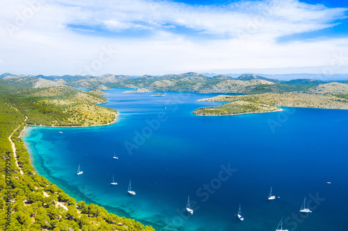 Aerial view of the blue bay and small islands in nature park Telascica, Croatia, Dugi otok, yachts anchored on shore