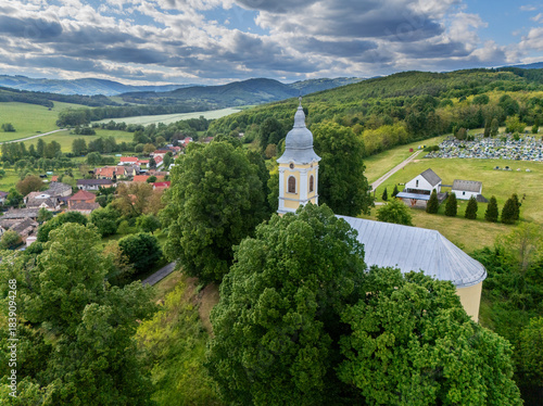 up high, aerial, architecture, building, central europe, christianity, church, cloud, countryside, cultural, drone, environment, european, greenery, hill, historical, horizon, house, landmark, landscape, nature, outdoors, pastoral, religion, religious, roof, rural, scenery, settlement, sky, slovakia, church steeple, tour tourism, travel, tree, view, village