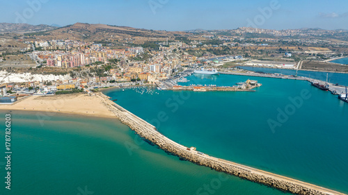 Aerial view of the city of Porto Empedocle, in the province of Agrigento, Sicily, Italy. In the foreground, the city port overlooking the Mediterranean Sea. Sea water is crystal clear and turquoise.