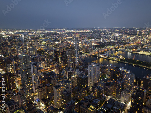 Aerial view of the city's illuminated skyscrapers and the East River reflects the twilight sky, a modern marvel of urban architecture, New York, New York, United States.