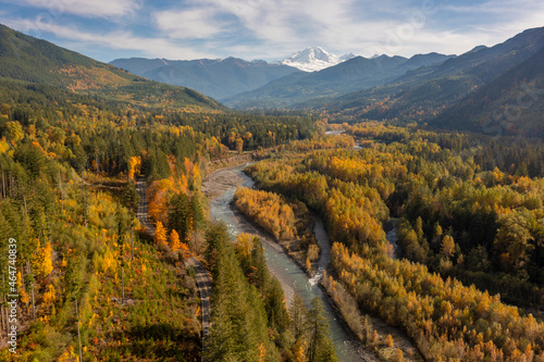 Aerial View of the Magnificent Nooksack River Valley During the Autumn Season. Fall color adds to this beautiful scenic drive up the Mt. Baker Highway to the recreation area of the Pacific Northwest.
