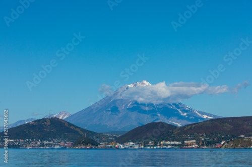mountain, water, landscape, sea, sky, mountain, nature, blue, cloud, travel, ocean, view, snow, coast, cloud, volcano, beautiful, tour tourism, coastline, panorama, summer, kamchatka, russia