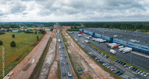 Aerial view of the road construction Kekava Bypass. New section of the road A7 Riga, Bauska and a part of the international road E67 Via Baltica