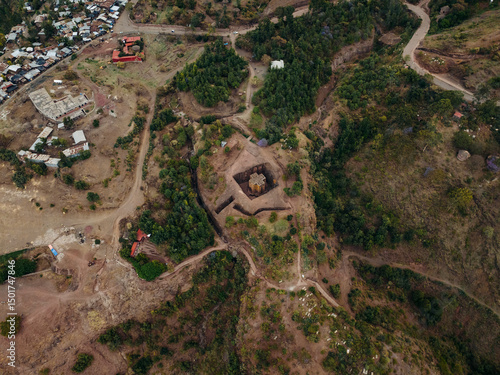 up high, adventure, aerial, ancient, archaeology, architecture, beautiful, building, cultural, drone, ethiopia, exploration, forest, heritage, historic, holy, house, iconic, landscape, mountain, natural, nature, overhead, pattern, perspective, road, sacred, spiritual, top, tour tourism, travel, tree, vale, view, village