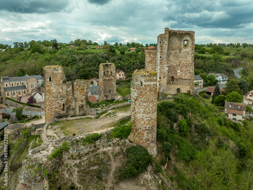 Aerial view of the ruins of Herisson fortress of the Dukes of Bourbon dominate the medieval city of Hérisson and Aumance Valley with towers standing tall in the inner castle in central France