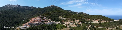 Aerial view of the village of Marciana alta. Marciana, Elba island, Livorno, Italy