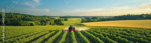 Aerial View of Tractor Spraying Fertilizer on Lush Green Agricultural Field During Sunny Day in Countryside
