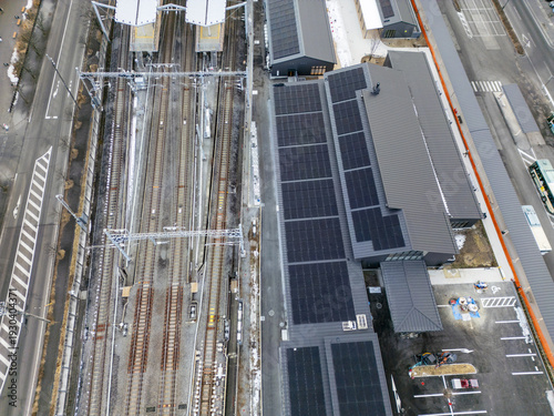 up high, aerial, architecture, building, city landscape, daytime, drone, energy, engineering, geometric, infrastructure, japan, landscape, line, modern building, panel, car park, pattern, perspective, platform, railway, renewable energy, road, rooftop, snow, solar energy, solar panel, station, street, structure, sustainability, track, train, train track, transportation, travel, urban, vehicle, view, winter
