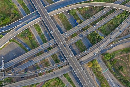 Aerial view of transport junction road with car movement, Transport industry concept.
