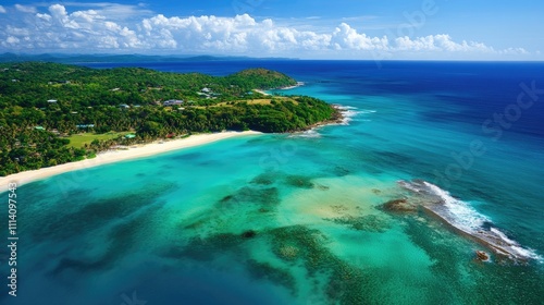 Aerial view of tropical island beach, turquoise water, lush greenery, and coastline.