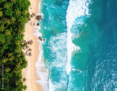 beach, ocean, sea, water, wave, sand, shore, coast, coastal, aerial, topview, landscape, seascape, turquoise, blue, white, green, tree, vegetation, tropical, island, paradise, nature, vacation, holiday, travel, destination, summer, sunlight, daylight, outdoors, environment, scenic, beauty, tranquil, calm, relaxing, texture, pattern, foam