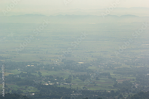 Aerial view of vast green landscape with distant hazy mountains, peaceful rural scenery and natural countryside atmosphere.